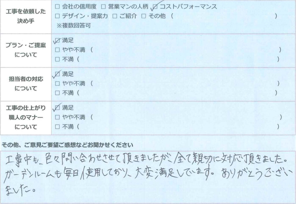 工事中も、色々問い合わせさせて頂きましたが、全て親切に対応頂きました。ガーデンルームも毎日使用しており、大変満足しています。ありがとうございました。