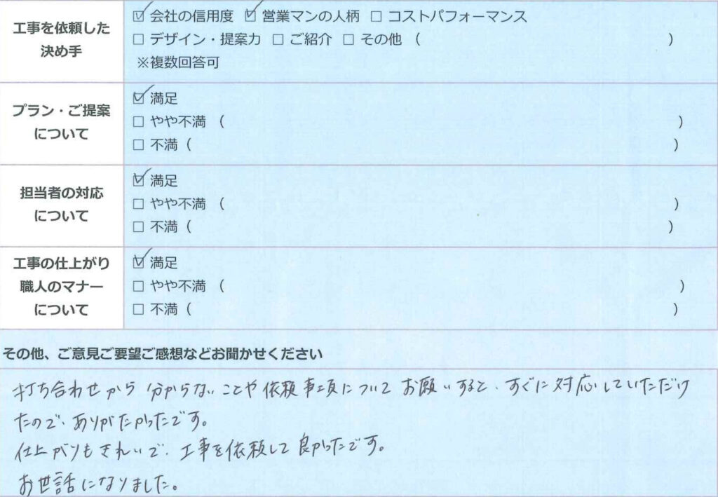 打ち合わせから分からないことや依頼事項についてお願いすると、すぐに対応していただけたので、ありがたかったです。仕上がりもきれいで、工事を依頼して良かったです。お世話になりました。