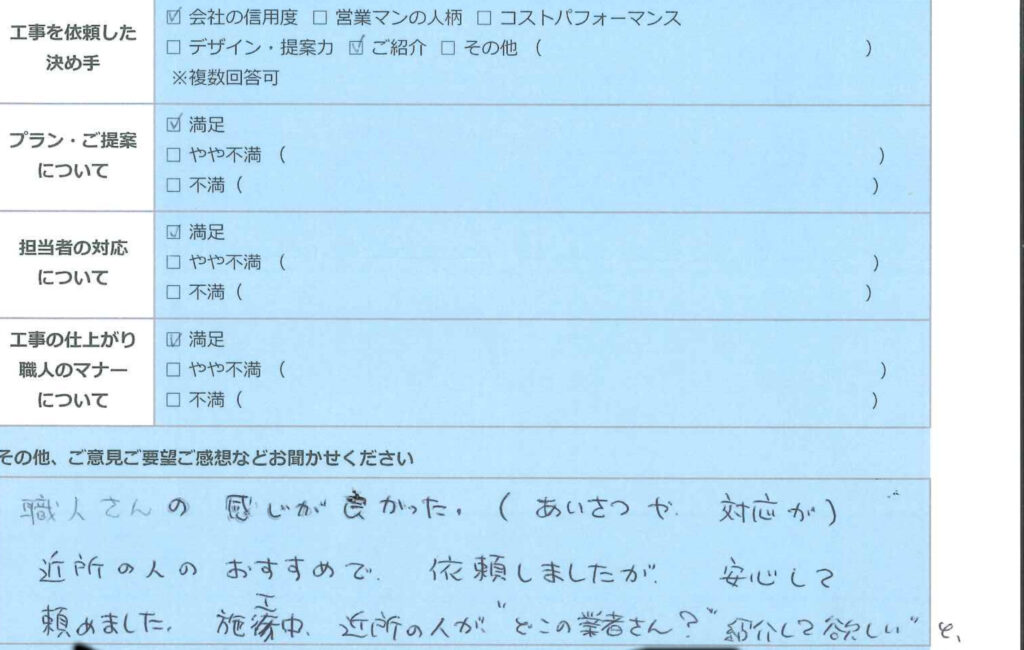 職人さんの感じが良かった。(あいさつや対応が) 近所の人のおすすめで、依頼しましたが、安心して頼めました。 施工中、近所の人が“どこの業者さん?紹介してほしい”と聞きにきました。