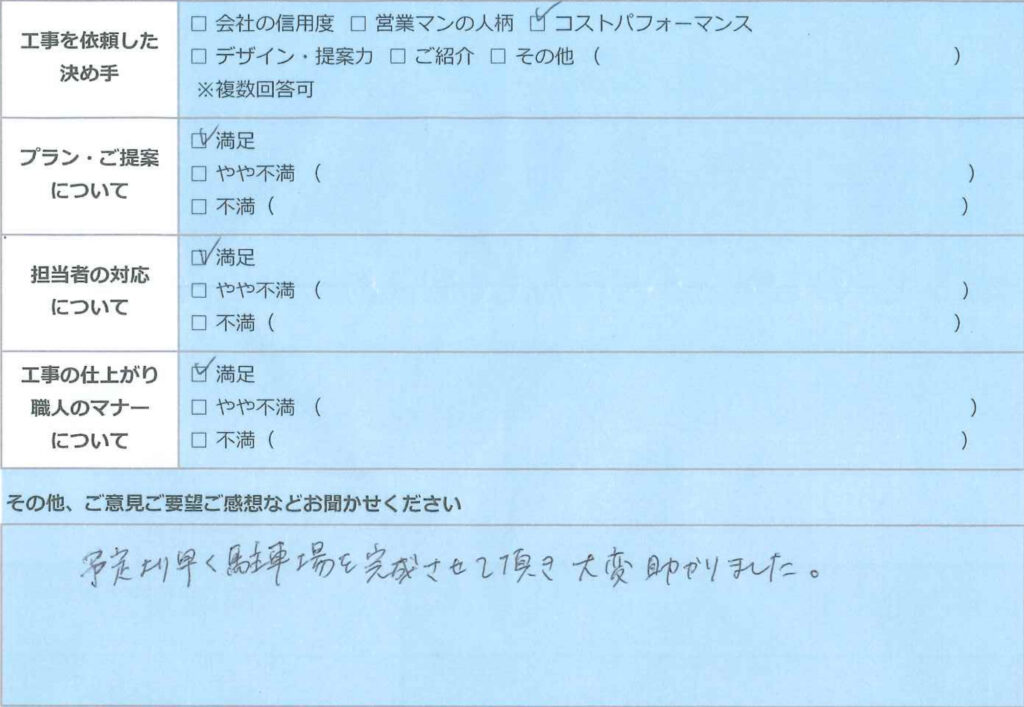予定より早く駐車場を完成させて頂き大変助かりました。