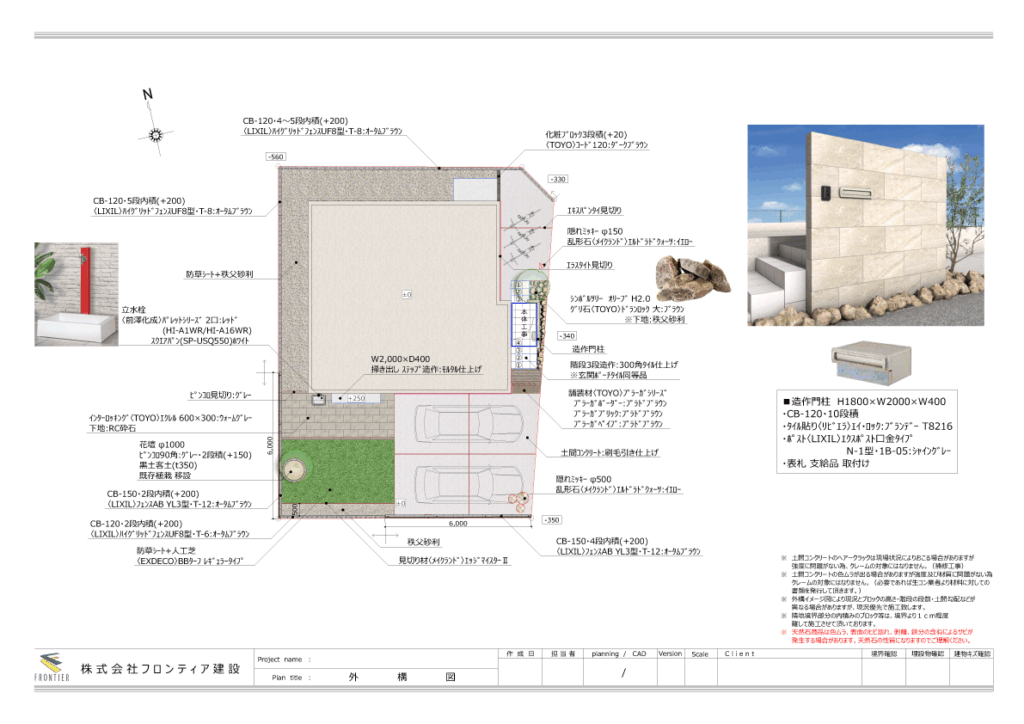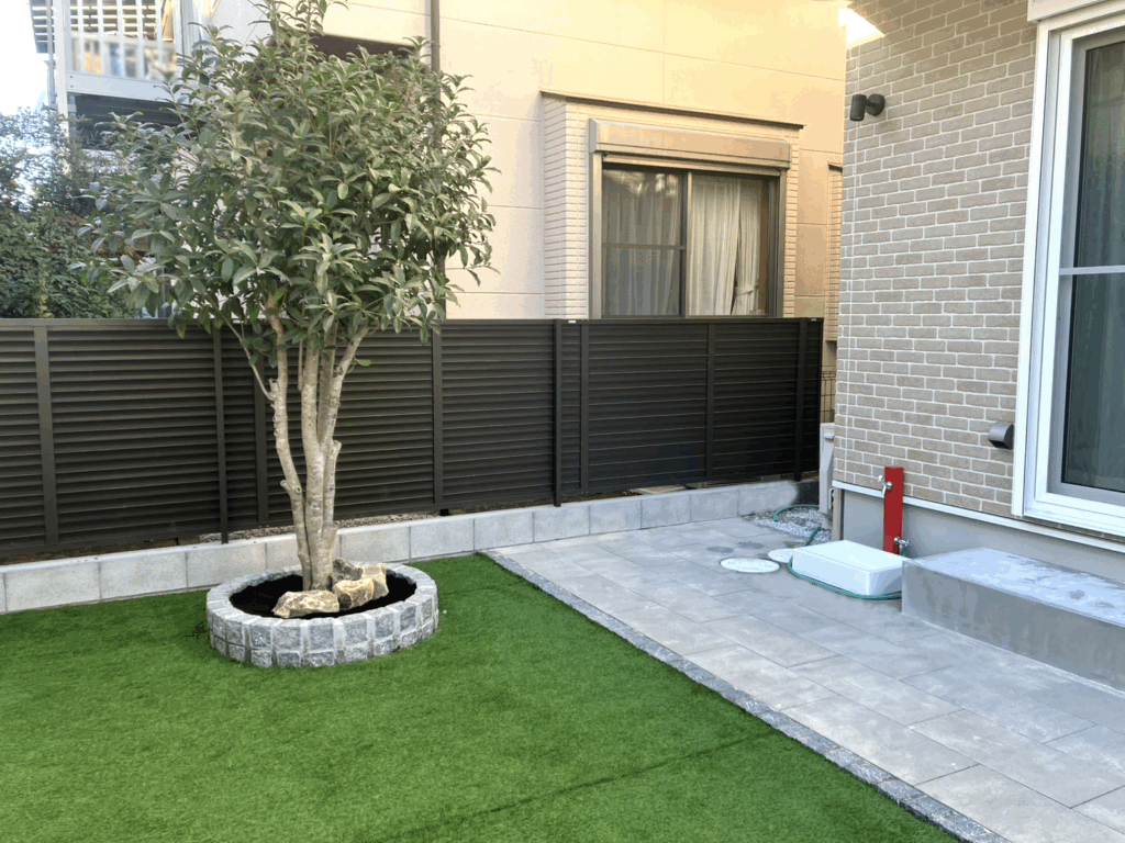 造作門柱、土間コンクリート、人工芝、防草シート、フェンス、立水栓