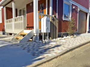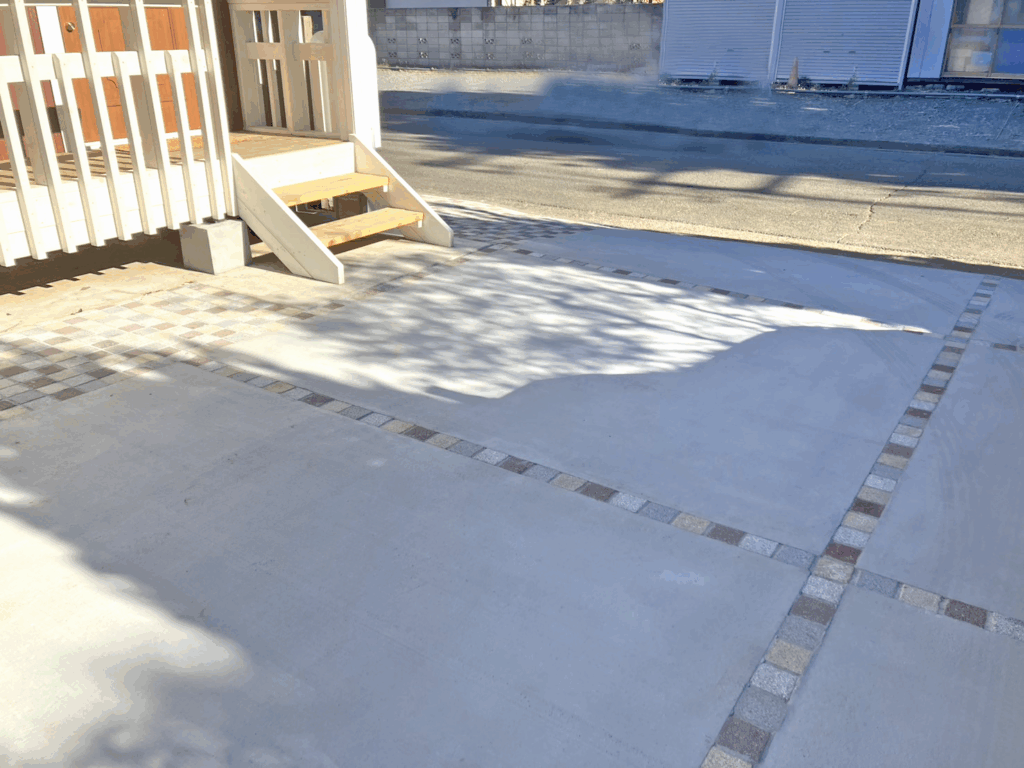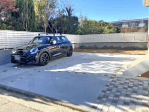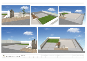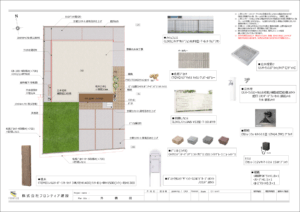造作門柱、土間コンクリート、人工芝、防草シート、フェンス、立水栓、照明、砂利
