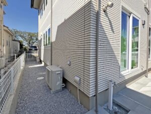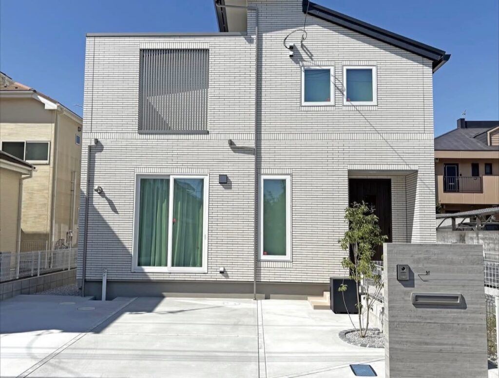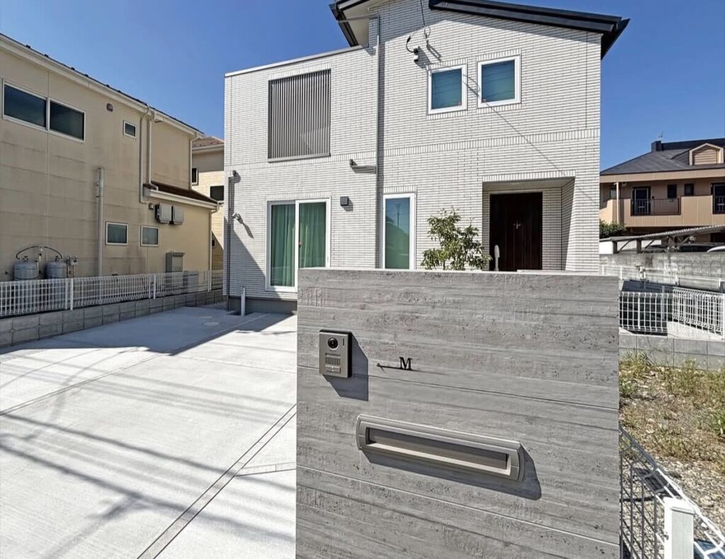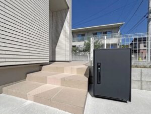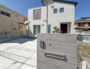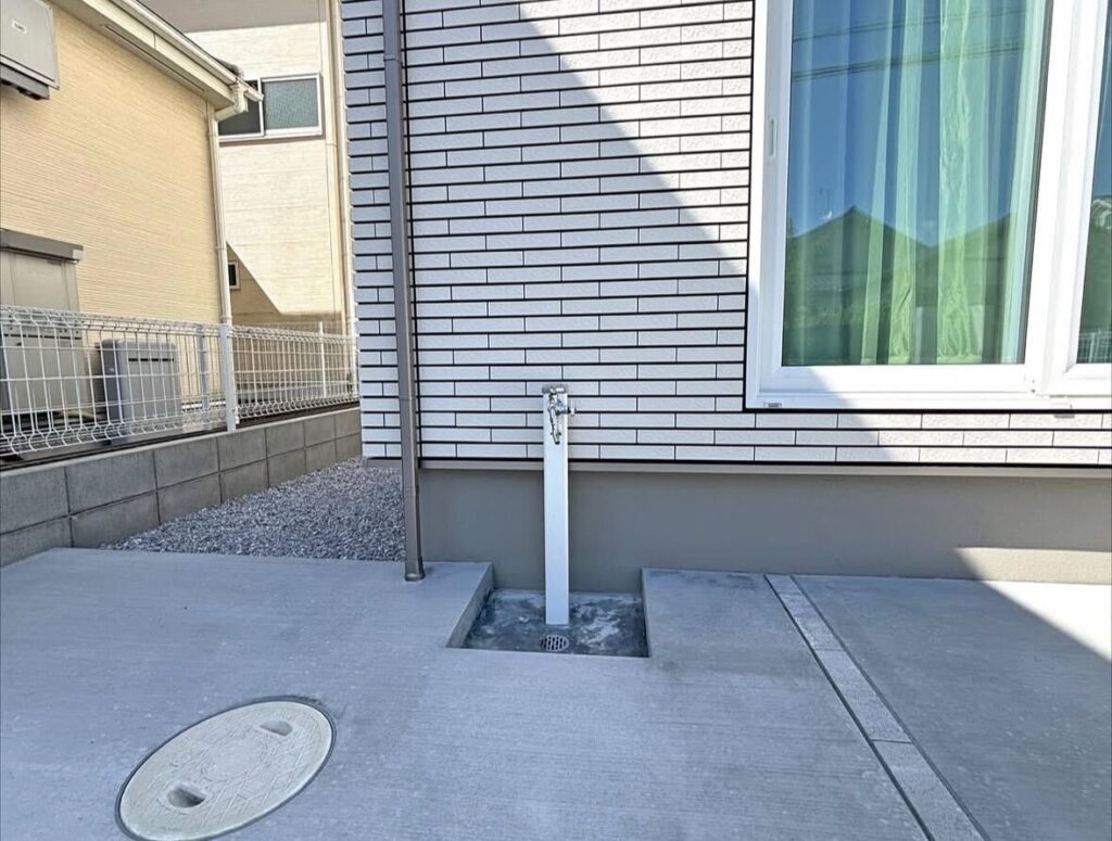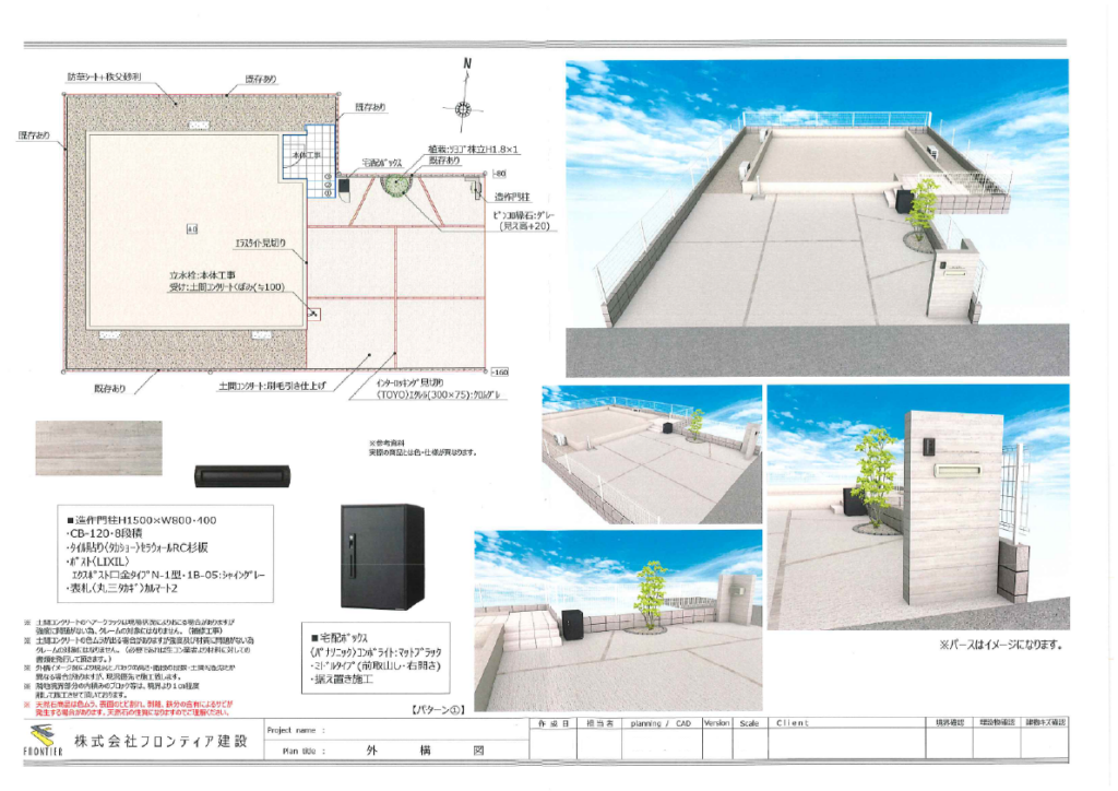 造作門柱、宅配ボックス、土間コンクリート、立水栓、砂利、防草シート、芝、フェンス、タイル、植栽